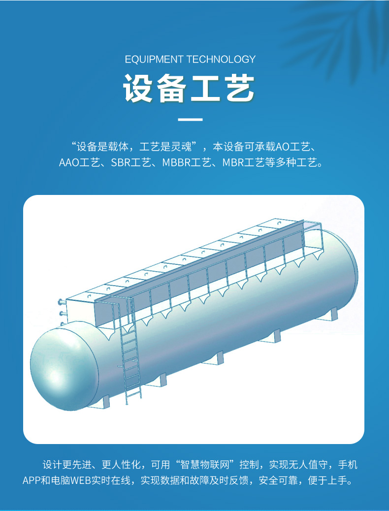 “設(shè)備是載體,工藝是靈魂”,QD-MBR膜生物反應(yīng)器 一體化污水處理設(shè)備可承載AO工藝、AAO工藝、SBR工藝、MBBR工藝、MBR工藝等多種工藝。