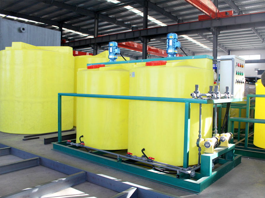 1、攪拌機:由攪槽機和攪拌裝置組成。其作用是使需投加的溶質和水(溶劑)按一定比例配置后,使其充分混合。