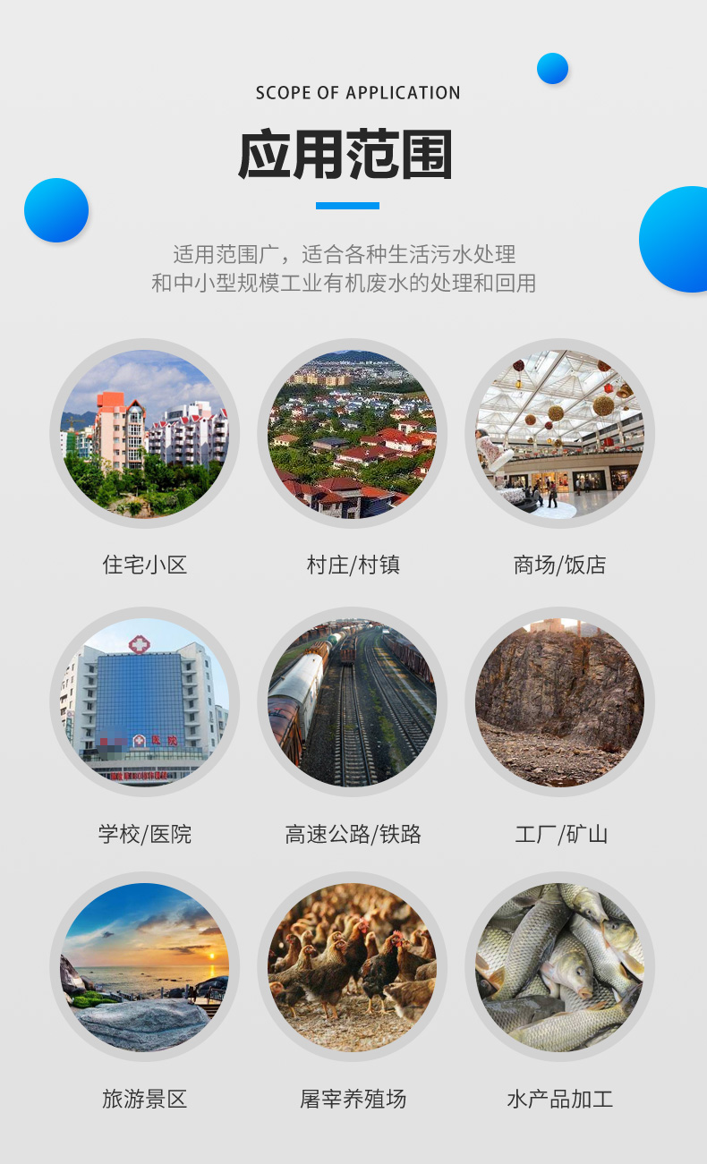 適用于住宅小區(qū)、村莊、村鎮(zhèn)、辦公樓、商場、賓館、飯店、療養(yǎng)院、機(jī)關(guān)、學(xué)校、醫(yī)院、高速公路、鐵路、工廠、礦山、旅游景區(qū)等生活污水和與之類似的屠宰、水產(chǎn)品加工、食品等中小型規(guī)模工業(yè)有機(jī)廢水的處理和回用。
